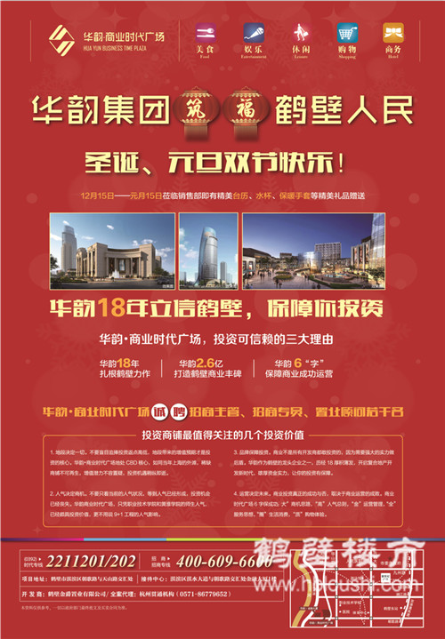 鹤壁楼市网讯(价格 户型图 动态 楼盘评论): 华韵集团筑福鹤壁人民圣诞、元旦双节快乐!12月15日--元月15日莅临销售部既有台历、水杯、保暖手套等精美礼品相送!华韵·商业时代广场诚聘招商主管、招商专员、置业顾问若干名。