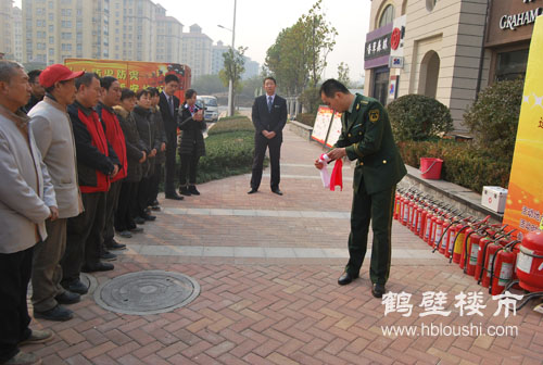 淇滨区消防大队指导员王茂盛,给业主和物业工作人员示范讲解如何防范火灾的消防知识和灭火器的使用方法、逃生技巧、就便器材的使用等等,还进行了现场模拟演习,楼道逃生用毛巾捂住口鼻的模拟体验,用灭火器灭火体验和现场实际楼房发生火灾救人等实地实人演练。