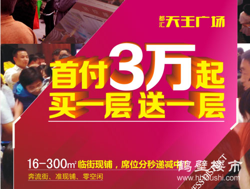 都汇·天王广场是鹤壁市广源置业有限公司继广源·新都汇之后的重磅商业力作,倾心打造的集购物、餐饮、休闲娱乐等多种商业业态有机组合的双首层,休闲体验潮流街区。特推出“首付3万起买一层送一层”优惠活动!16—300㎡临街商铺,席位分秒递减中!