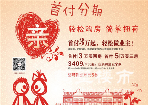 鹤壁楼市网讯:星河湾首付分期,轻松购房,简单拥有。首付3万起,轻松做业主!其河畔,CBD旁,鹤壁首家38万㎡地中海纯湾居生活,首付3万买两房,首付5万买三房,3409/㎡元起,在淇河边安个家,131-208㎡花园电梯洋房,89-139㎡水景华宅!【招聘置业顾问5名】