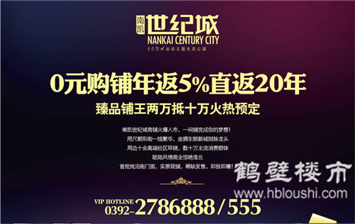 鹤壁楼市网讯:(价格 户型图 动态 楼盘评论) 南凯·世纪城0元购铺年返5%直返20年,铺王两万抵十万火热预定中!南凯·世纪城商铺火爆入市,一间铺完成你的梦想!咫尺朝阳街一线繁华,坐拥东部新城财脉龙头,周边十余间高端社区环绕,数万主流消费群体,欧陆风情商业惊艳淮北,首批纯沿街门面,实景现铺,稀缺发售,即投即赚!