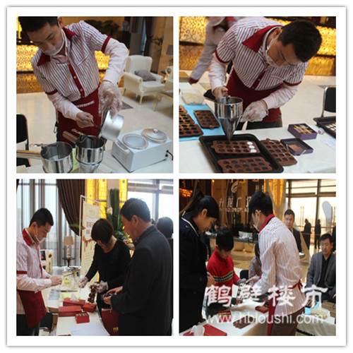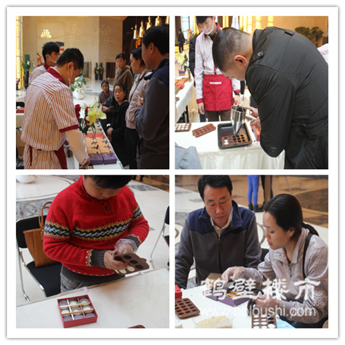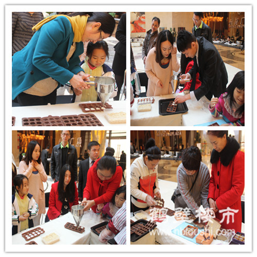 现场,巧克力DIY师傅亲自教我们:先把成块的黑白巧克力在专锅融化开,然后用工具把它们挤压到硅胶的多样的模具中在空气中静置几分钟,最后把这些模具放入冰箱冷冻5分钟后拿出来装进精美巧克力盒子里就OK了。