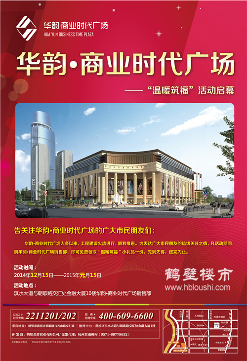 鹤壁楼市网讯(价格 户型图 动态 楼盘评论): 告关注华韵·商业时代广场的广大市民朋友们:华韵·商业时代广场入冬以来,工程建设火热进行,顺利推进。为表示广大市民朋友们的热切关注之情,凡活动期间,到华韵·商业时代广销售部,即可免费领取“温暖筑福”小礼品一份,先到先得,送完为止!