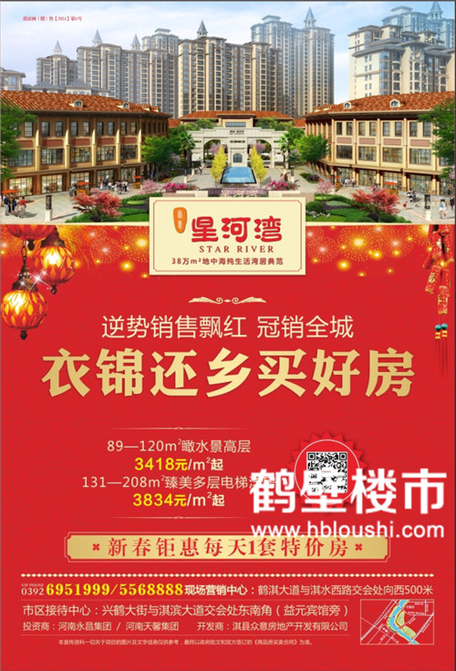 鹤壁楼市网讯(价格 户型图 动态 楼盘评论):  星河湾新春钜惠每天1套特价房!逆势销售飘红,冠销全城!衣锦还乡买好房,89—120㎡瞰水景高层3418元/㎡起、131—208㎡臻美多层电梯洋3834元/㎡起。春节返乡置业,来星河湾看看吧!