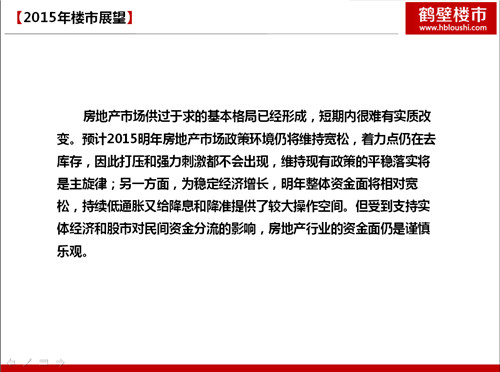 由河南楼市网数据研究中心联合鹤壁楼市网精心编制的《2014年鹤壁房地产市场行情分析报告》于2015年1月28日分别通过鹤壁楼市网WAP平台、网站平台、微信公众平台隆重发布。本报告从国内房地产总体概述、全国宏观经济环境、房地产政策法规、鹤壁土地交易行情、房地产市场交易行情分析、楼市活动、鹤壁房地产面临的机遇和挑战、房地产市场展望等方面详细解读和分析,有理有据,图表分明,数据详实,成为鹤壁房地产业第一份详实阐述鹤壁2014年房地产市场行情的报告,也是鹤壁楼市网2015年新春之礼,以飨各位新老朋友和网友!