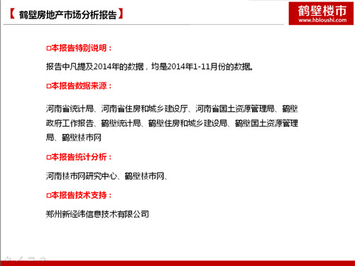 由河南楼市网数据研究中心联合鹤壁楼市网精心编制的《2014年鹤壁房地产市场行情分析报告》于2015年1月28日分别通过鹤壁楼市网WAP平台、网站平台、微信公众平台隆重发布。本报告从国内房地产总体概述、全国宏观经济环境、房地产政策法规、鹤壁土地交易行情、房地产市场交易行情分析、楼市活动、鹤壁房地产面临的机遇和挑战、房地产市场展望等方面详细解读和分析,有理有据,图表分明,数据详实,成为鹤壁房地产业第一份详实阐述鹤壁2014年房地产市场行情的报告,也是鹤壁楼市网2015年新春之礼,以飨各位新老朋友和网友!