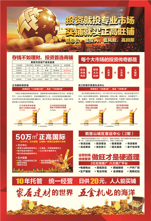 鹤壁楼市网讯: 豫北•正高国际广场总占地470亩,总建筑面积约50万平方米,总投资约22亿元人民币。项目整体规划建设为一个大型的商贸物流产业园区,分为六大板块;总投资约22亿元人民币。由中国商业地产20强——欧蓓莎集团统一运营管理。项目全部建成后将成为豫北地区档次最高、规模最大、品类最全、服务最优、配套最完善的“一站式”商贸展示交易中心。五万拿到正高旺铺!1000抵10000 VIP卡火爆预约登记中……