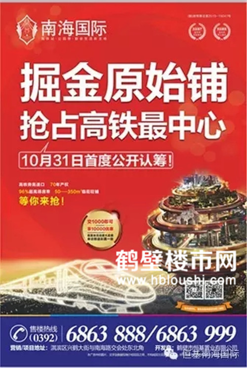 鹤壁楼市网讯: 南海国际黄金旺铺火爆认筹!高铁旁高速口70年产权,96%超高得房率 50—350㎡临街旺铺,等你来抢!交1000即可享10000优惠,造富翁活动盛大启幕,来访即送彩票一张!现五证齐全,封顶准现房95-126㎡温馨三房、136㎡奢适三房公开发售,欢迎品鉴!