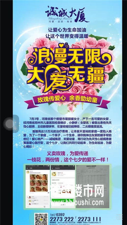 鹤壁楼市网讯: 七夕,原本是浪漫的代言词,然而在此刻的鹤城,有个家庭却因为闺女的医疗费一筹莫展。美丽的鹤城、喧闹的街道、闪烁的霓灯与病床上娇小的幼童、屋内悲伤的双亲、晃眼的手术灯形成了鲜明的对比,这个原本快乐温馨的小家庭,还未曾体会到初为人母、初为人父的乐趣就被告知闺女——洪静妍犯有先天性心脏病,急需治疗否则随时就有生命危险。高昂的手术费及后期维护费让这个本不富裕的家庭更是愁上加愁。为了挽救孩子的生命,这个家庭背负了沉重的精神压力与经济负担。一方有难,八方支援!此时此刻,请伸出您的爱心援手,救救这个可爱的孩子。诚城集团,数十年来一直默默的致力于爱心事业,初闻噩耗,便召开紧急董事会,将原定的七夕活动变换一种方式展示给新老客户以及其他鹤城百姓。用不一样的爱点燃七夕爱心灯,诚城大厦七夕义卖玫瑰,募集善款全部赠与先天性心脏儿童——洪静妍。这个七夕,让爱不孤单,诚城在行动!