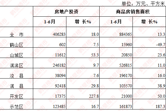 2017年1-6月鹤壁市各区域房地产投资及商品房销售面积情况