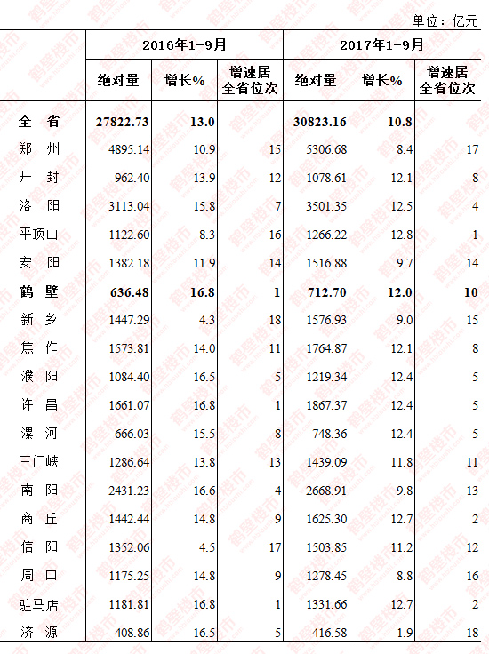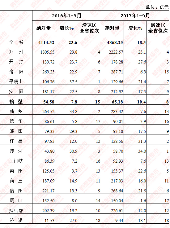 二、2017年1-9月鹤壁市固定资产投资情况: