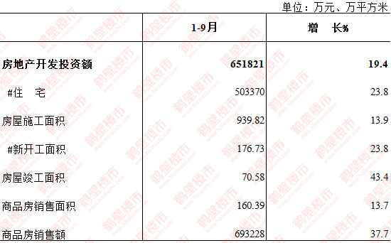 2017年1-9月鹤壁市房地产开发投资为65.18亿元,增长19.4%;其中住宅开发投资额为50.34亿元,增长23.8%。2017年1-9月鹤壁市房地产房屋施工面积为939.82万平方米,增长13.9%;其中新开工面积为176.73万平方米,增长23.8%。2017年1-9月鹤壁市房屋竣工面积为70.58万平方米,增长43.4%;商品房销售面积为160.39万平方米,增长13.7%;商品房销售额为69.32亿元,增长37.7%。