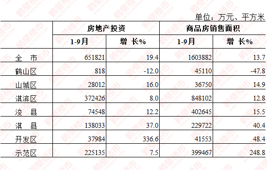 2017年1-9月鹤壁市各区域房地产投资及商品房销售面积情况
