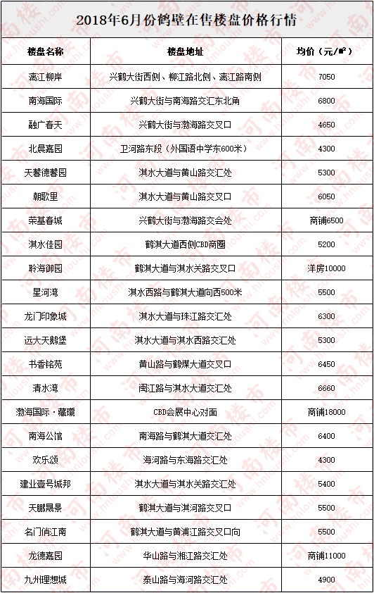 关于楼盘价格问题大家一直都迫切关注,为了给广大置业者购房提供便利,鹤壁楼市网为大家整理出鹤壁市2018年6月份最新房价,以便大家能对各区楼盘信息有快速的了解,供大家置业参考。