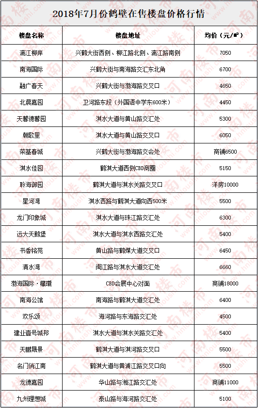 2018年7月份鹤壁市在售楼盘价格行情