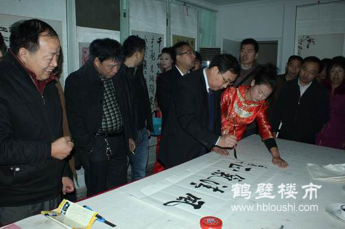为庆祝党的十八大,讴歌山城新变化,11月9日,翰墨山城“常绿•林溪谷”杯鹤壁市书画名家笔会暨文化精品邀请展在枫岭公园举行。副市长高雅玲,市文联主席李建东,区委书记胡润身,区委常委、区纪委书记王庆彬,区委常委、区委办主任张海军,区委常委、常务副区长白树民,副区长李晓莉等领导和嘉宾出席开幕式并观看展览。