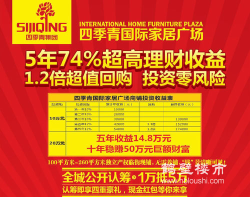 摘要:四季青国际家居广场,5年74%超高理财收益,1.2倍超值回购,投资零风险。五年收益14.8万元,十年稳赚50万元巨额财富。