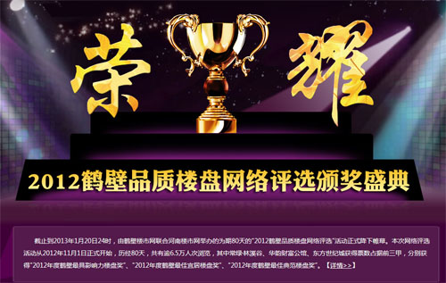 荣获2012鹤壁品质楼盘网络评选最具影响力的楼盘奖有:常绿·林溪谷、 东方世纪城、华韵财富公馆、天鹏御璟。